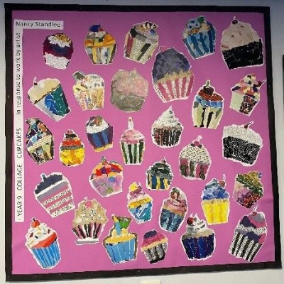 Year 9 students have been creating some fantastic, colourful collage cupcakes inspired by the work of artist Nancy Standlee.  Using ripped magazine pages, they produced vibrant and imaginative designs bursting with texture, pattern, and personality. We enlarged copies of some delicious-looking examples to put on display in the Wakely Building — a sweet treat for the eyes!